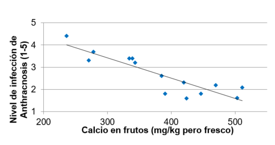 Altas concentraciones de Calcio en frutos se asocian a reducciones en la sensibilidad a Anthracnosis (1= no padece hasta 5= daño severo) evolución y maduración de frutos de “Hass” .